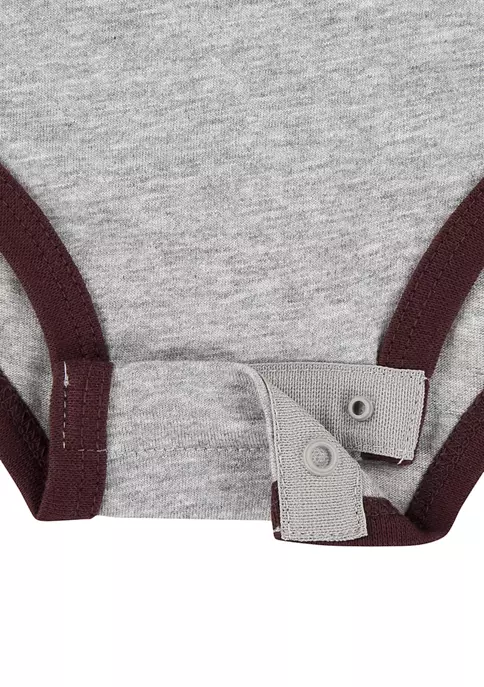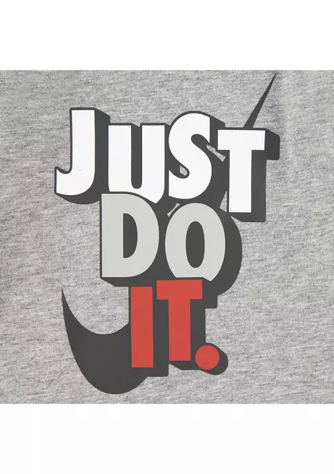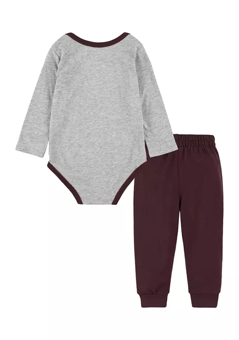 This “Just Do it” emblazoned bodysuit and matching sweatpants feature an easy to get into snap closure and brown detailing around the legs and neck.