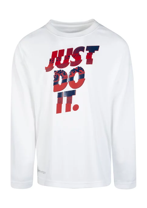 Sporting the iconic Nike® slogan, this graphic t-shirt is soft and lightweight to keep him comfortable while he plays.