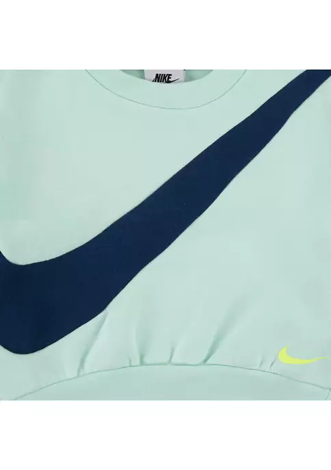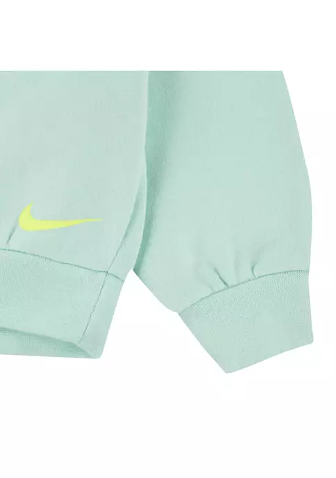 This toddler’s fleece set features a mint green pullover, with a navy swoosh. The coordinating sweatpants are the same shade of navy.