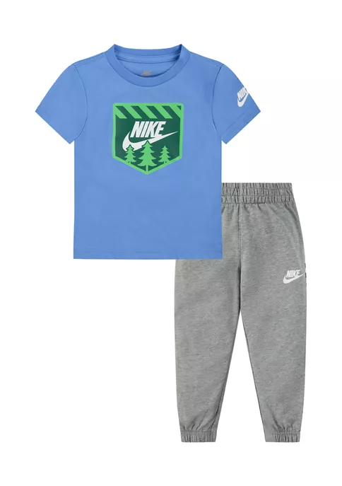 Your nature-loving little boy will love this outdoor-inspired set from Nike®, featuring a short sleeve t-shirt and comfy pants.