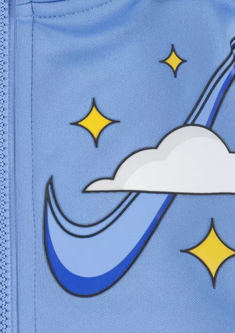 A whimsical Nike® swoosh logo graphic dons the chest of the zip-up hooded jacket in this set that comes with elastic pants.