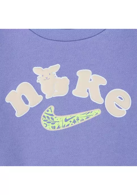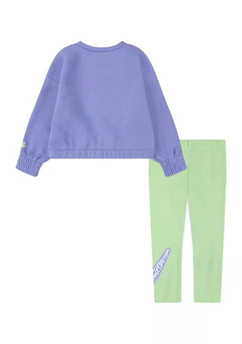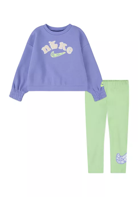 She’ll be comfy and casual in this sweatshirt and leggings set featuring a fun version of the Nike® logo.